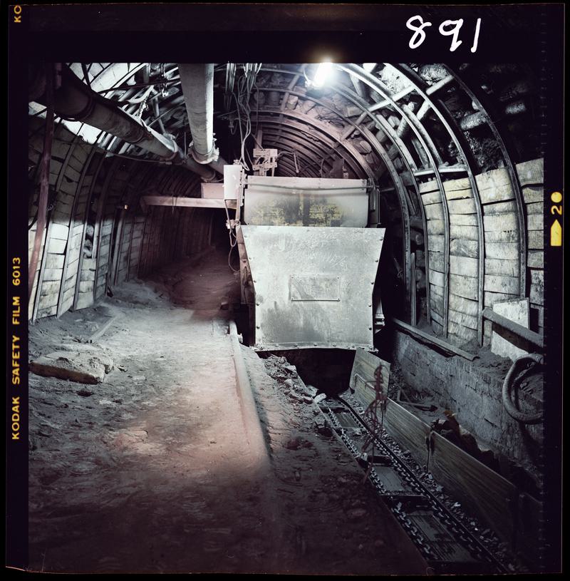 Black and white film negative showing a conveyor belt suspended from steel rings, Penrhiwceibr Colliery.