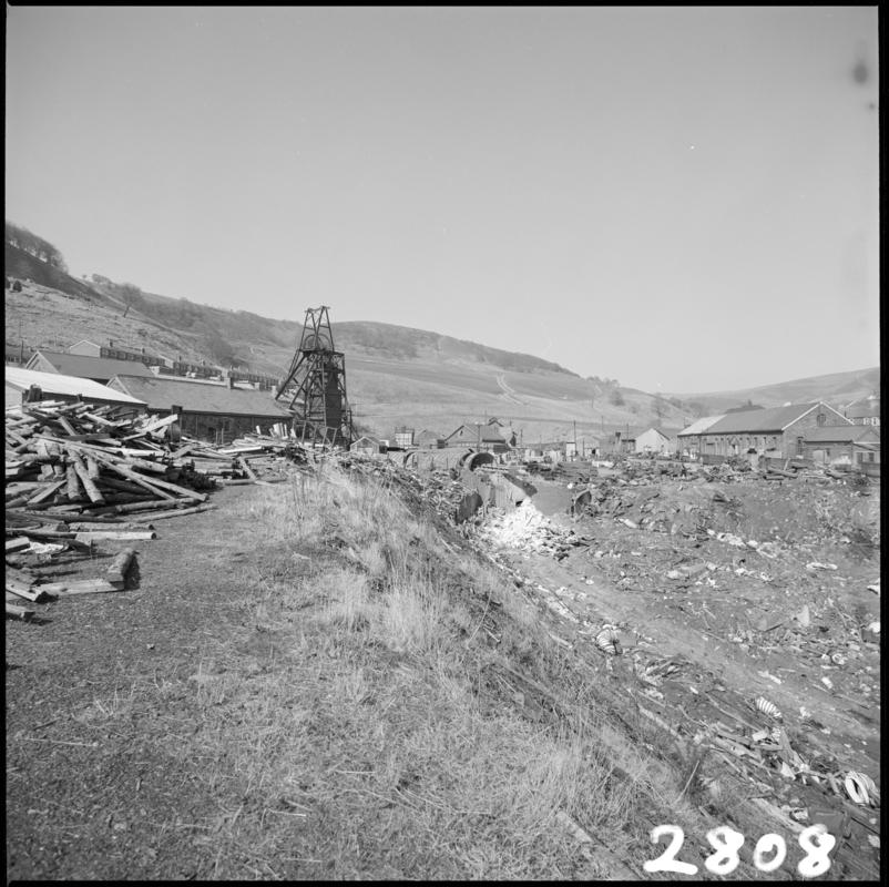 Black and white film negative of a photograph showing a view towards Hafodyrynys Colliery.