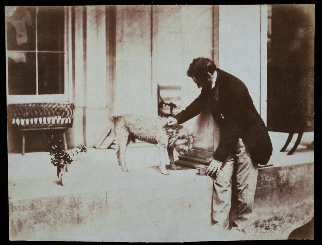 Collodion glass negative. Self portrait of John Dillwyn Llewelyn sat with elbow on table with two flower pots of spring flowers.
