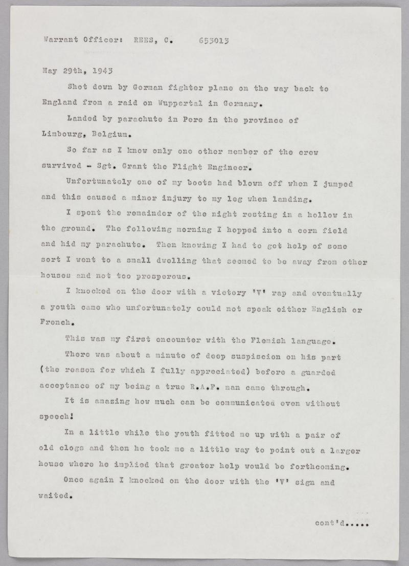 Part of a collection of items belonging to Cecil (Joe) Rees. Cecil (Joe) Rees was a member of the RAF and took part in several bombing raids during the Second World War. His plane was shot down in May 1943 on the way back from a raid on Wuppertal, Germany. While sheltering with a Flemish family, Cecil was captured by the Germans and sent to the prisoner of war camp, Stalag Luft 3. However he managed to escape but was recaptured by the Germans and sent back to the camp.