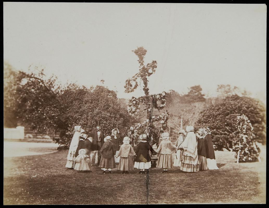 Salted paper print, from Collodion glass negative. Group of adults and children circling a maypole.