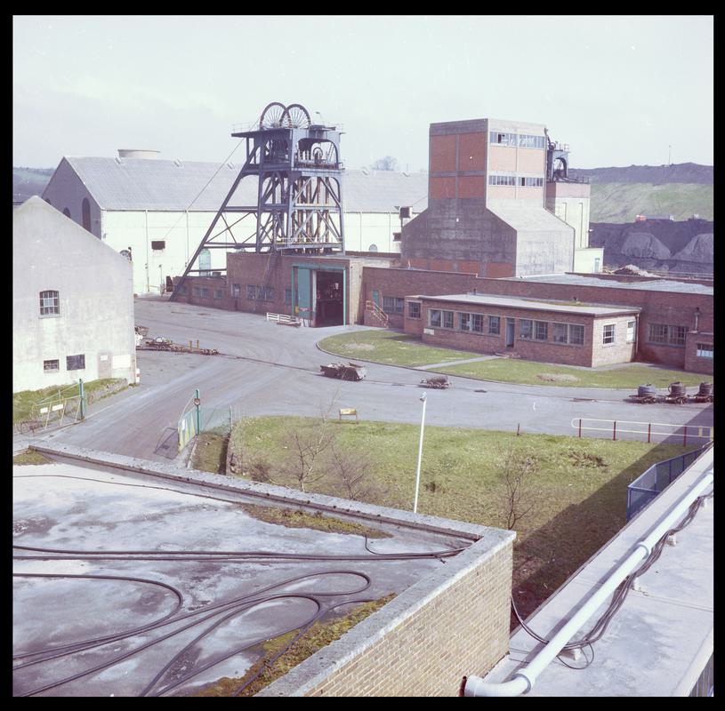 Black and white film negative showing levels, Llanhilleth Colliery 25 March 1983. 'Levels Llanhilleth 25 March 1983' is transcribed from original negative bag.