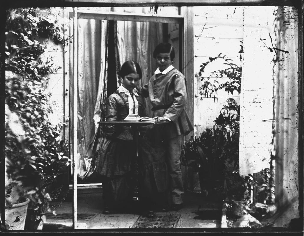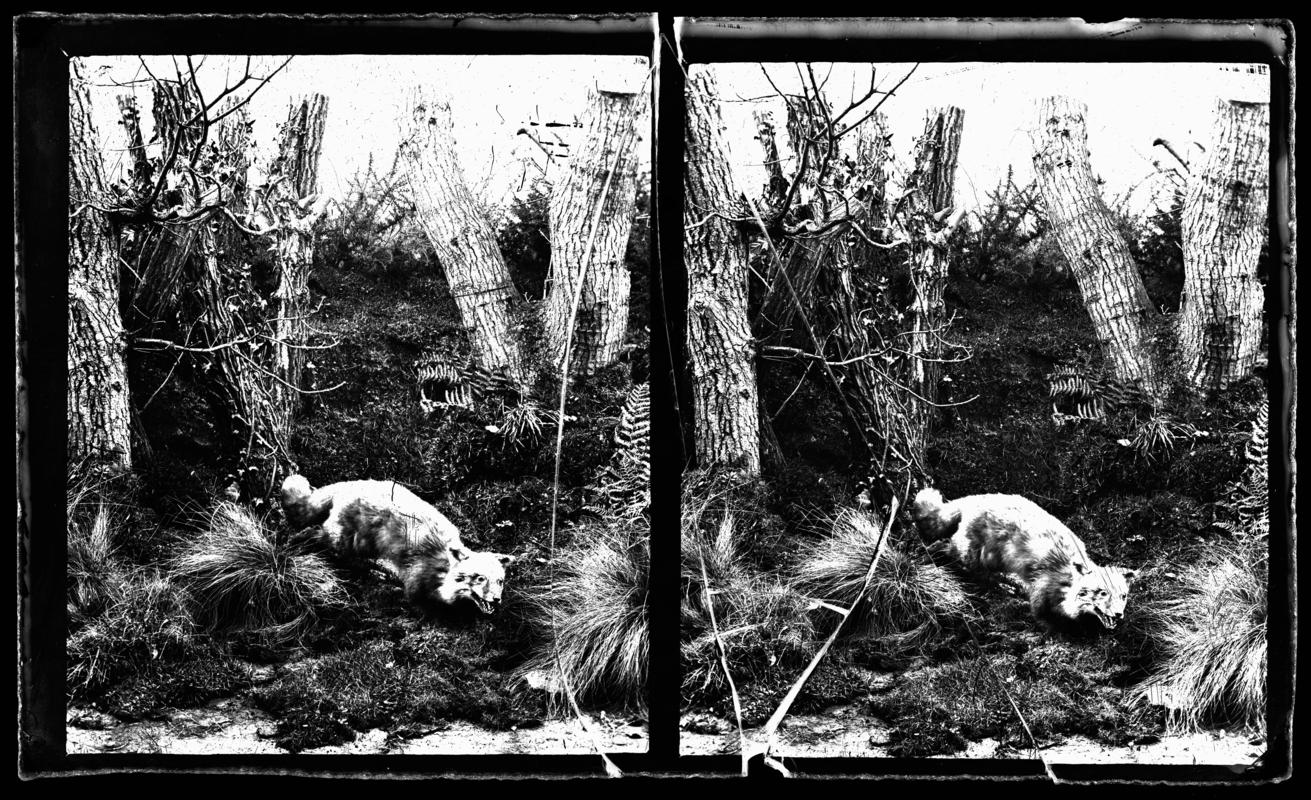 Glass negative taken on stereo camera showing stuffed pheasants in a wooden landscape.