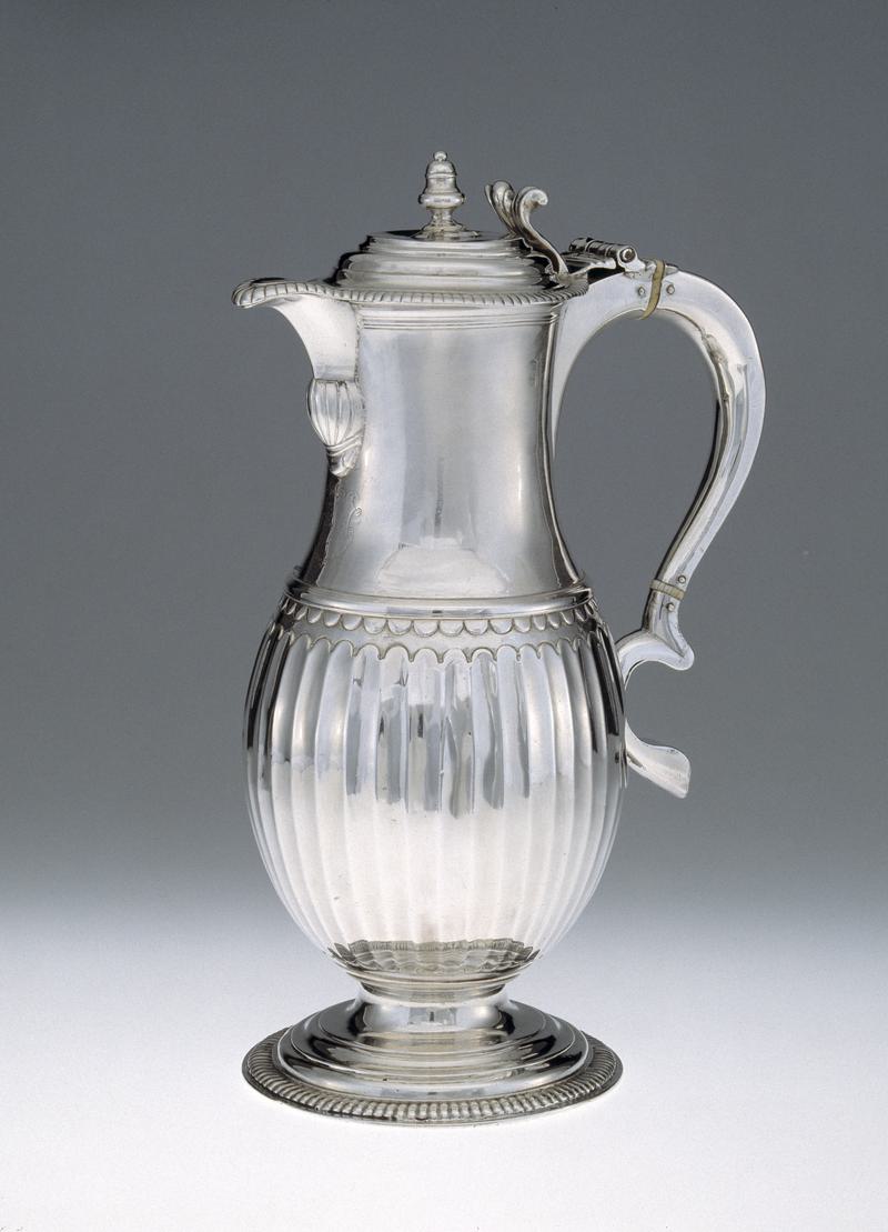Hot-water jug, with cylindriacl body cast with (?) apples in shallow relief, shallow V-shaped spout, flat cover with small lip and tongue shaped thumbpiece. Simple tapering C-scroll handle covered with wicker. Shallow spreading foot. N.B: Received with hinge distorted.