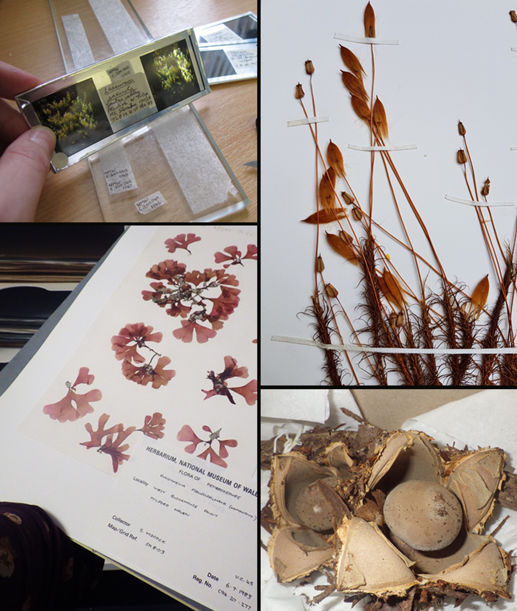 An estimated 337,000 specimens in Amgueddfa Cymru – Museum Wales herbarium are lower plants, mainly consisting of bryophytes (mosses, liverworts and hornworts) coming to around 280,000 specimens. However, there are also many specimens of lichens (45,000), fungi (6,700) and algae (5,000).