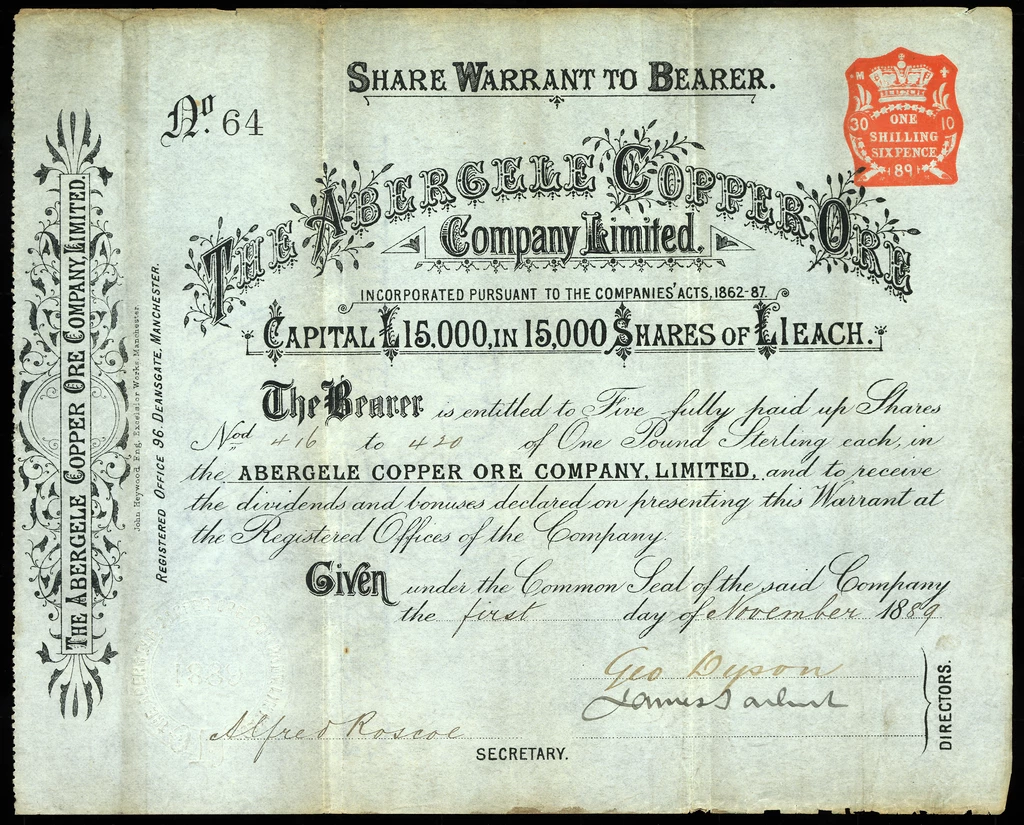 - Share certificates from across Welsh industry and transport; especially non-ferrous mining companies.