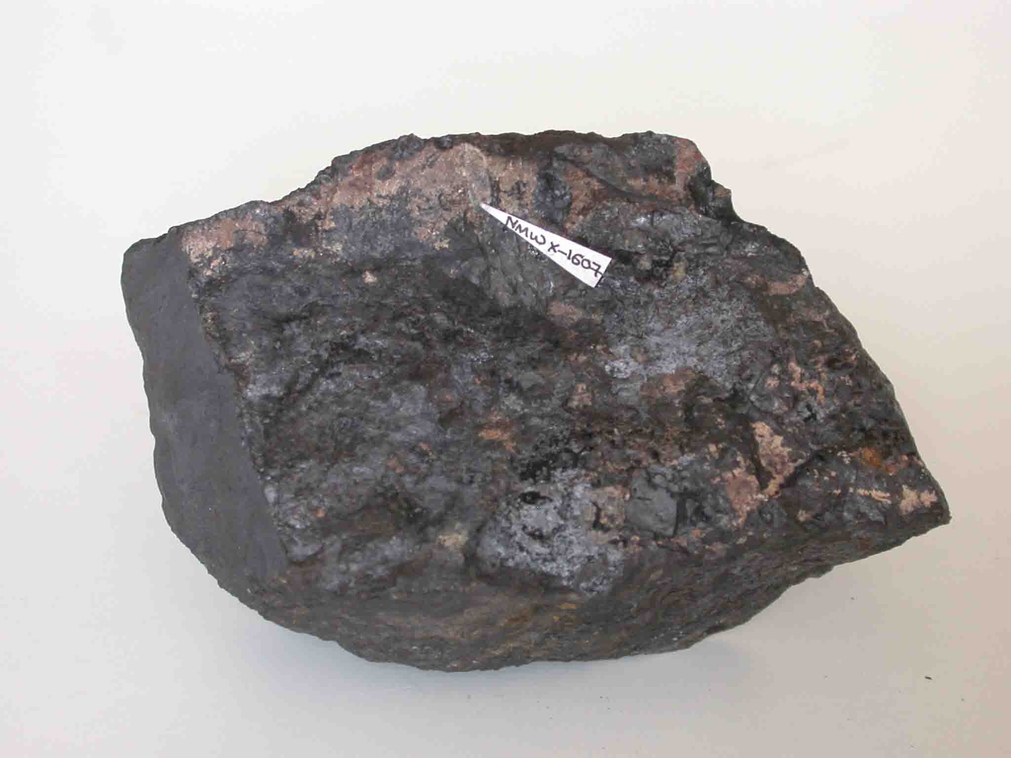 Brown tephroite associated with metallic grey jacobsite. Nant Mine, Rhiw, Ll?n, Gwynedd. Specimen 8.8 cm long. National Museum of Wales specimen. Photo T.F. Cotterell, © National Museum of Wales.