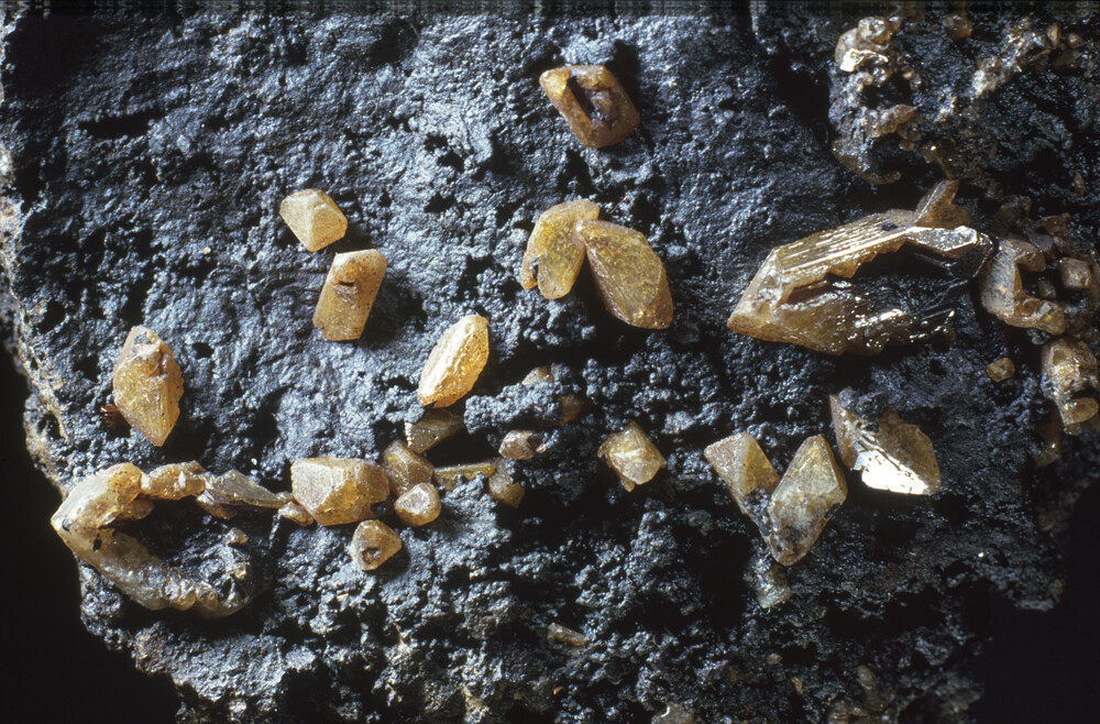 Anglesite crystals, up to 10 mm across, on gossan, from the type locality, Parys Mountain, Anglesey, North Wales. National Museum of Wales Collection (NMW 86.83G.M.1). Photo M.P. Cooper, © National Museum of Wales.