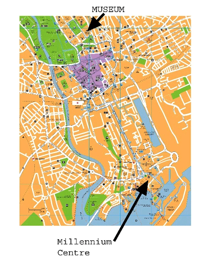 The Cardiff Centre/Bay map has the museum in the top right of square 1B. The Millennium conference centre is in the bottom right of 5D