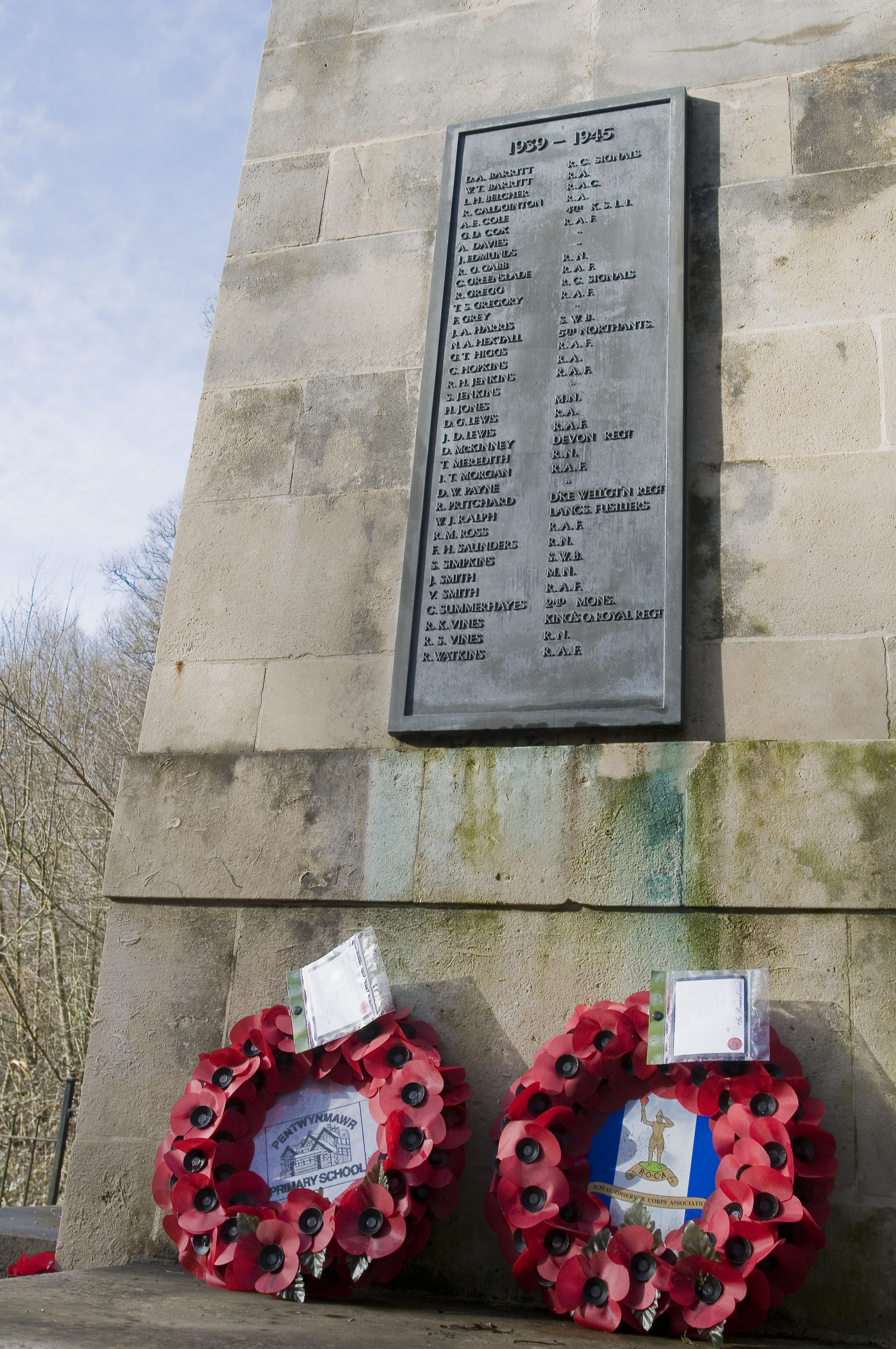 Wreaths of red poppies are placed in front of the memorial to commemorate all those who have died in the two world wars.