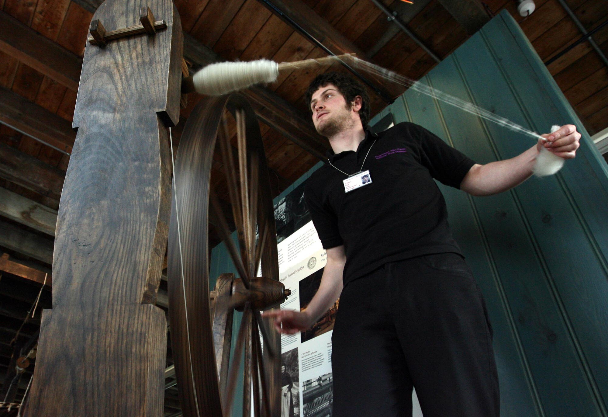 The Great Wheel on display was commonplace by the 1300s. Operated by standing, they were relatively cheap to buy so that even poor families could afford one. The Treadle or Anglesey Wheel, a later and more expensive invention, allowed the spinner to sit down while working.